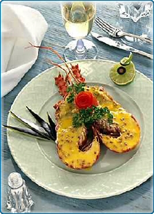 1 langouste, 4 maracudjas ou fruits de la passion, 10 cl vinaigre blanc, 10 cl vin blanc sec, 150 g de beurre, 5 cl d’huile, Sel, Poivre.